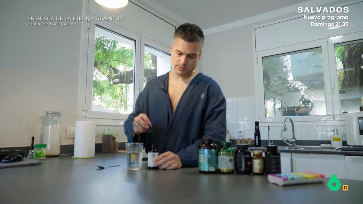 La cocina de Cuesta, quien llegó a pesar 100 kilos y fumaba y bebía, está ahora llena de suplementos: "Echo de cinco a 10 gotitas de azul de metileno, que ayuda a las mitocondrias a a crear energía". De esta forma, intenta reprogramar su cuerpo. Hasta ahora, se ha gastado más de 10.000 euros en la búsqueda de la eterna juventud y ha creado una "metodología de 90 días para frenar el envejecimiento" que cuesta "alrededor de los 1.000 euros".