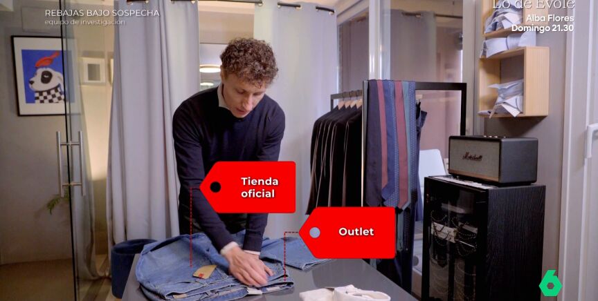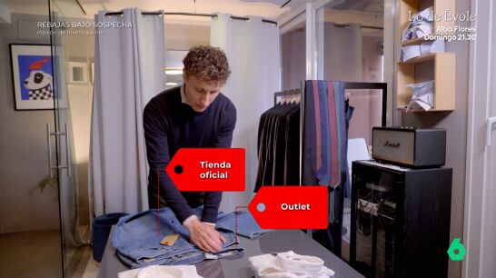 Tras comprar unos mismos productos en una tienda oficial y en un outlet, Vlad Marcos, un experto en el sector textil y diseñador de moda, analiza las diferencias entre las prendas: "Si nos fijamos, sobre todo en los vaqueros, aquí tenemos un parche de piel y aquí tenemos un parche tipo cartón, que son más baratos de hacer y esa es una diferencia que vemos muy a simple vista".