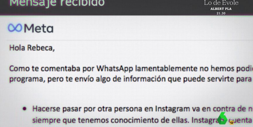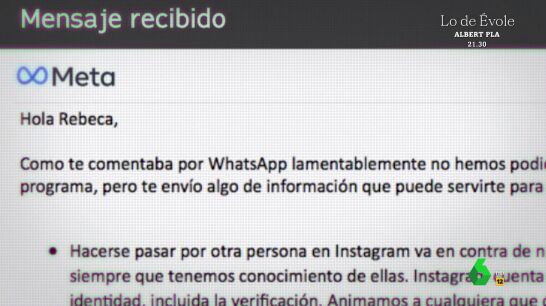Nos ponemos en contacto con la empresa a la que pertenece Facebook para hablar con uno de los responsables sobre los estafadores del amor y esta es la respuesta que recibimos en este programa de Equipo de Investigación de 2022, que laSexta ha vuelto a emitir este domingo.