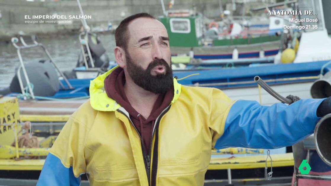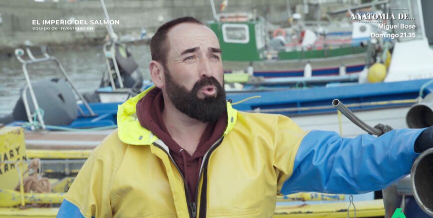 Equipo de Investigación se acerca a hablar con un pescador gallego, quien expresa su indignación con el salmón. "Vino una mafia con jaulas y nos desplazó de la zona", denuncia.
