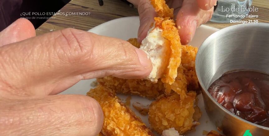 El pollo 'crispy' ha ido ganando terreno incluso en locales tradicionales. En uno de ellos, el experto analiza una pieza de una parte del pollo que define como "poco identificable": "Es una masa de no sabemos qué, la capa que hace al freírse y el agua que separa una cosa con otra, si fuera pollo de verdad nos costaría quitarle la cobertura", apunta.