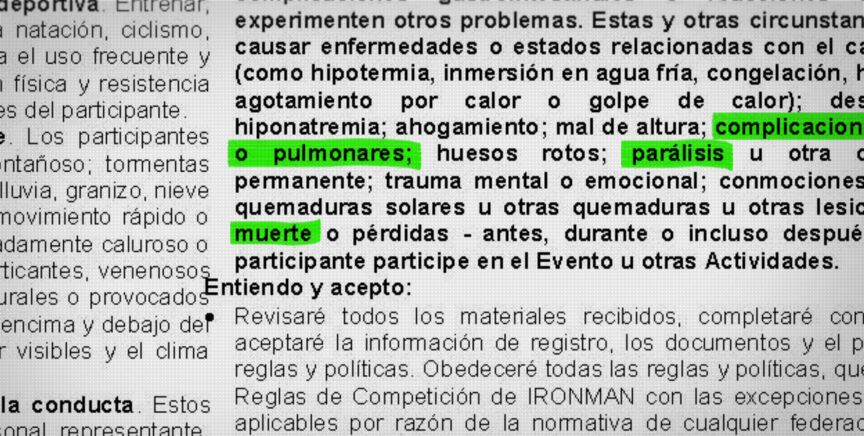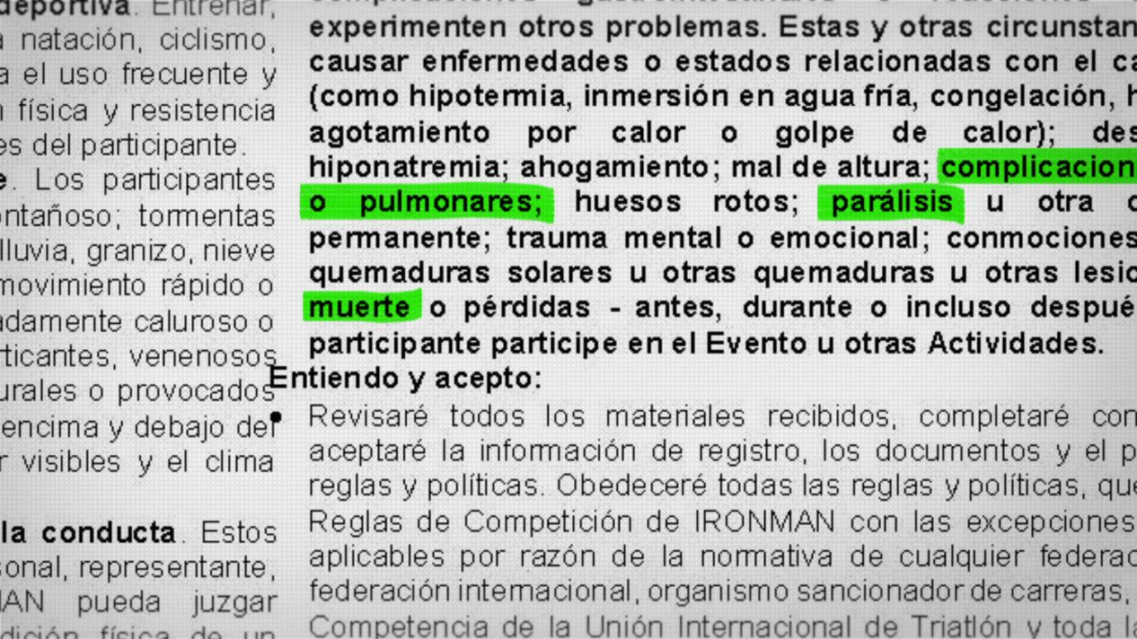 En el contrato que firman el participante asume que puede sufrir complicaciones cardíacas o pulmonares, parálisis cerebral e incluso la muerte. Además, si necesita atención médica, acepta correr con los gastos. Por último, renuncia a demandar a Ironman.