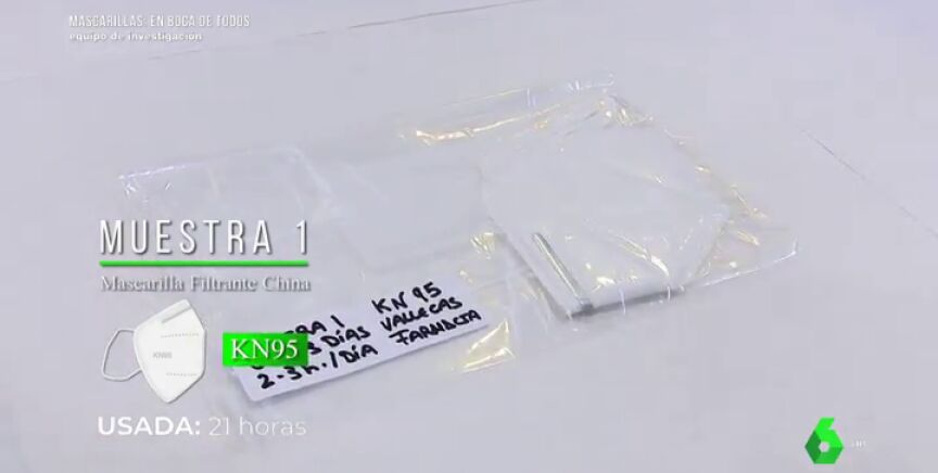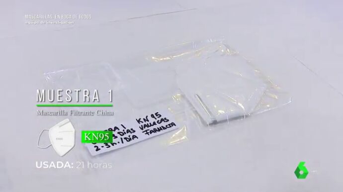 Equipo de Investigación lleva a analizar los tres tipos de mascarillas para saber el nivel de protección según su uso. La primera: una mascarilla filtrante china KN95 con 21 horas de uso. Esta clase de mascarillas protege en torno a un 95%. Es decir: "Solamente el 5% de partículas que estuviesen en el aire podrían ser capaces de penetrar a través de la mascarilla", explican los científicos que trabajan en el Parque Tecnológico de Paterna.