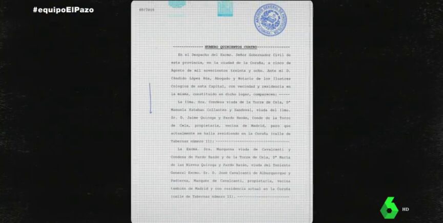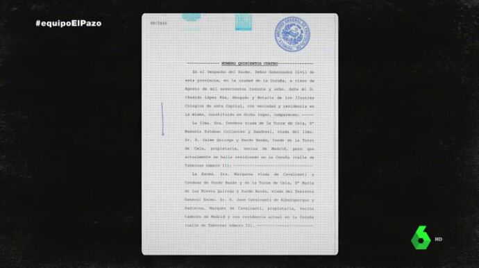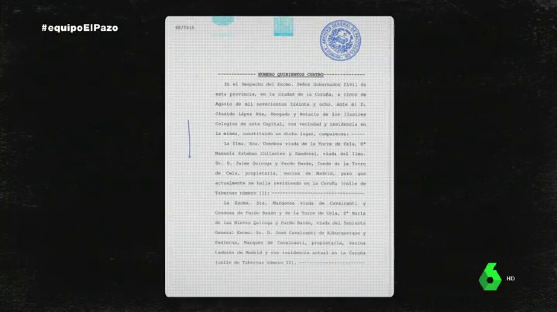 "Hicimos una investigación en los archivos notariales y descubrimos que existía una escritura pública del año 1938, en el cual, la entonces propietaria del Pazo de Meirás, heredera de Emilia Pardo Bazán, lo vendía a un organismo que se llamaba Junta Propazo del Caudillo", ha contado a Equipo de Investigación Consuelo Castro Rey, abogada general del Estado.