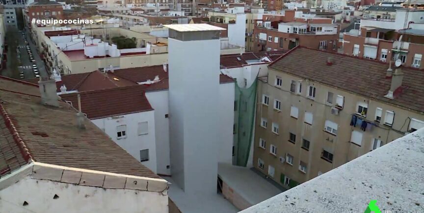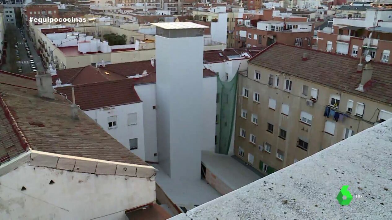 Además, el hombre destaca que "para 38 cocinas hacen falta más de 100 furgonetas todos los días". "Pero el problema no está ahí, sino en las motos, que si venden lo que tienen que vender supone hasta 2.850 al día", lamenta, a lo que añade: "No estamos exagerando, no somos unos quejicas, esto es una burrada". Subimos a la azotea del edificio, desde donde se ve la magnitud de la chimenea, de 27 metros de altura.