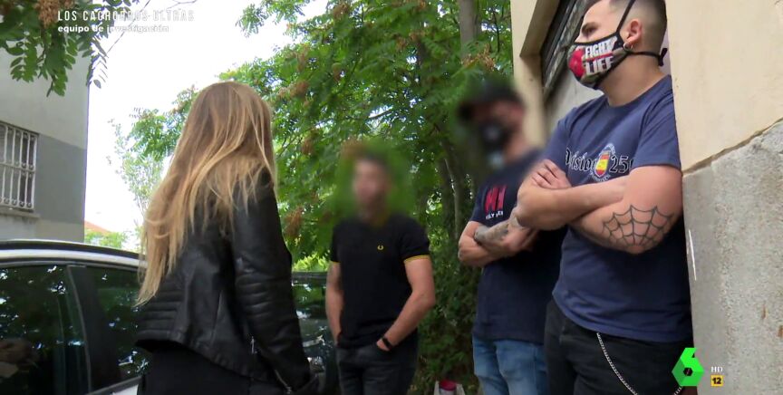 Además, se niegan a hablar sobre las acusaciones de la fiscalía por presuntos delitos de odio, sobre el presunto amedrentamiento a los vecinos de Fuencarral y sobre la incautación de algunas armas en ese local. "Vayan a buscar la delincuencia de verdad. Anda, a ver si leen un poquito", espeta uno de ellos.