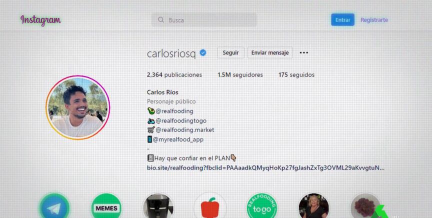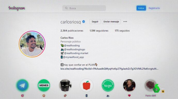 Carlos Ríos populariza el 'Realfooding' con sus 'nutrivueltas' por los supermercados. Graba 40 vídeos cada semana en los que clasifica a los buenos procesados y los ultraprocesados. Algunos alcanzan nueve millones de reproducciones. De esta forma, su cuenta de Instagram es su gran escaparate, donde le siguen famosas como Blanca Suárez o Pilar Rubio.