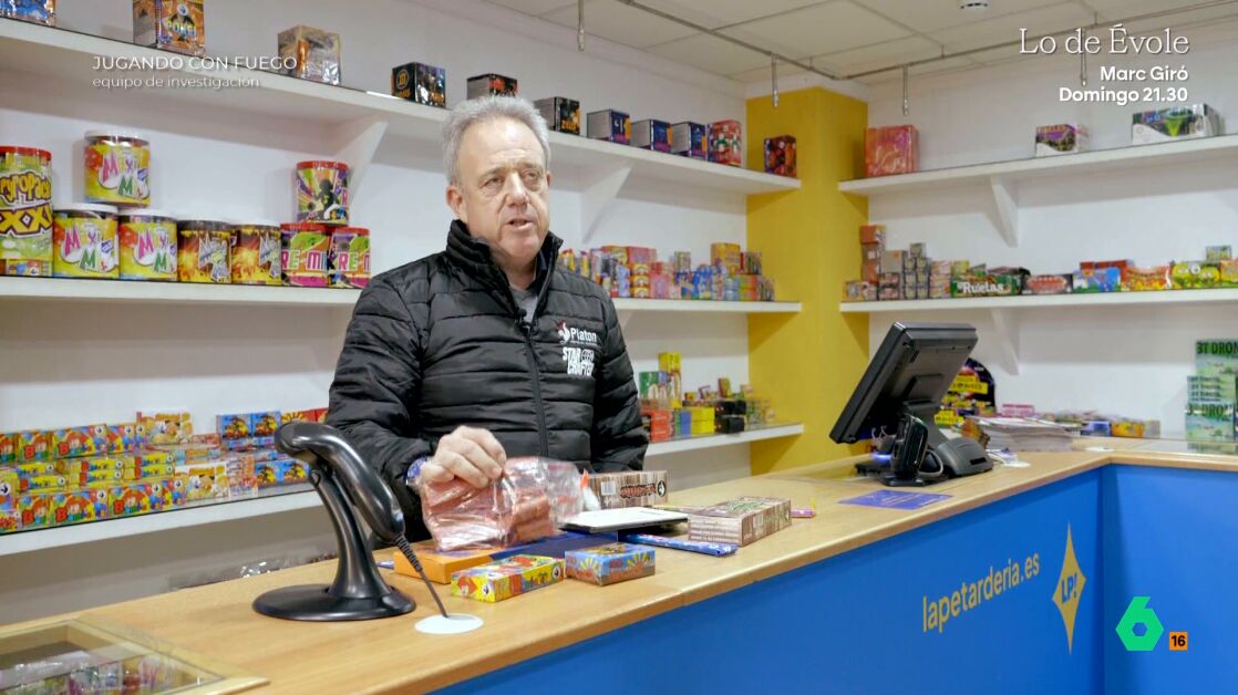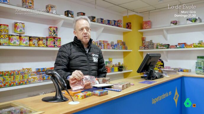 Cuando el programa le muestra la etiqueta de un petardo que tiene una carga de 200 gramos de pólvora, el comerciante afirma rotundo: "Eso es una auténtica barbaridad". Supera, según apunta, en 100 veces el petardo más potente que se vende en su tienda, cuya materia detonante no llega a los dos gramos. "Para mí esto no es un uso ilegal de productos ilegales, para mí esto es un acto de terrorismo puro y duro", sentencia.