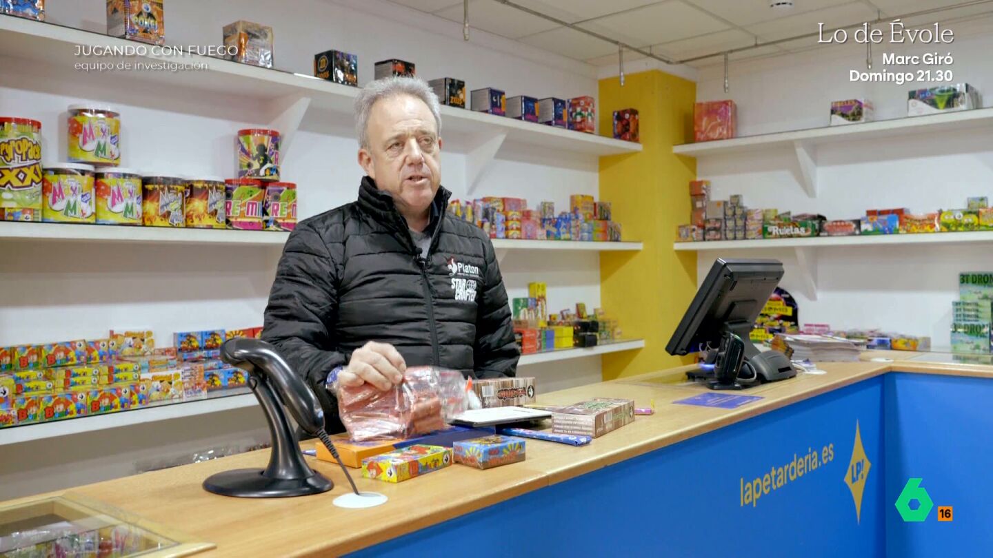 Samuel Albiñana, presidente de la Asociación de Comerciantes de Fuegos Artificiales, opina sobre la presencia en las Fallas de petardos ilegales, como el que le muestra Equipo de Investigación, 100 veces más potentes que el más grande que vende en su tienda.