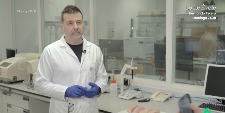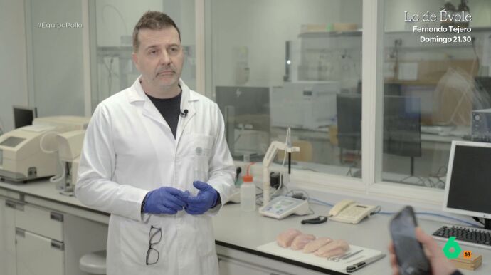 En el vídeo sobre estas líneas analiza un trozo de pollo y muestra unas líneas blancas en la carne: "Son estrías", señala el experto, que explica que se debe a que el músculo "ha crecido muy rápido". "Son las mismas estrías que le salen a los culturistas en el pectoral", señala.