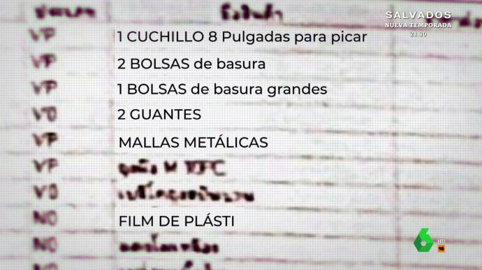 El personal del establecimiento declara que un joven extranjero hizo la compra dos días antes. Acceden al tique de compra: un cuchillo, bolsas de basura, guantes, 120 metros de film de plástico, gomas de atar, estropajos y algo de fruta.