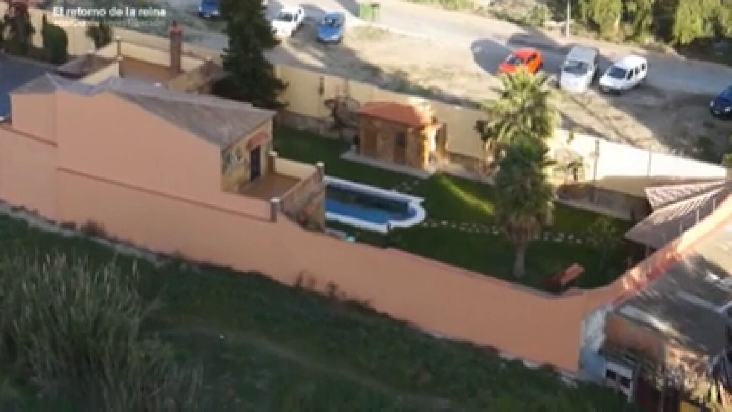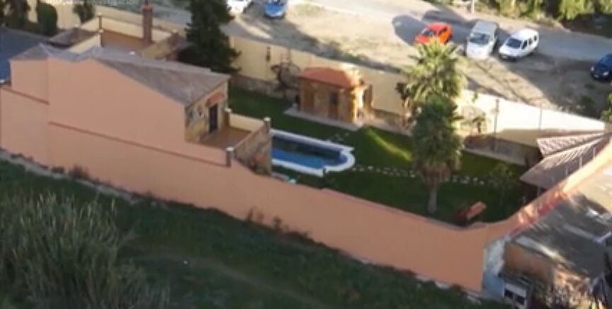 Su vivienda contrastaba con las del resto la barriada por sus altos muros. Una auténtica fortaleza, con piscina, repleta de medidas de seguridad, rodeada de casas mucho más sencillas. Equipo de Investigación llamaba a la puerta pero no obtenía respuesta. Para hacer una panorámica desde las alturas, se trasladó hasta la terraza de un edificio cercano.