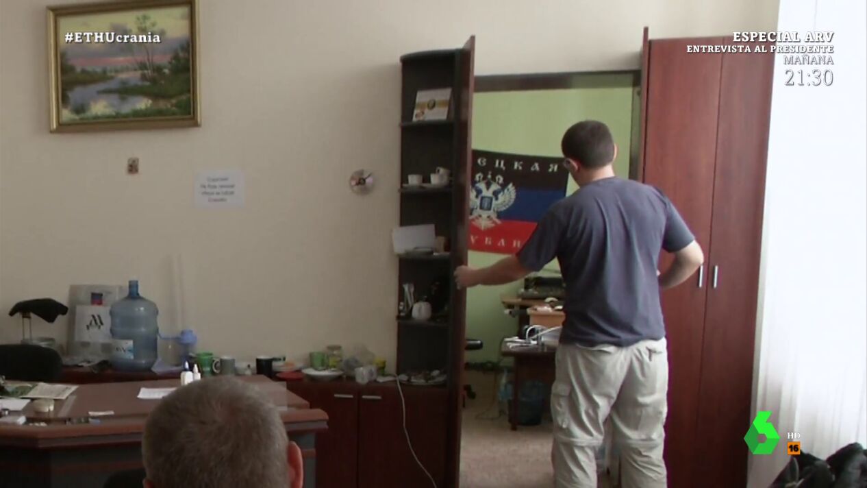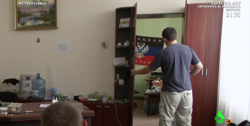 Tras 20 minutos, permiten pasar al equipo español, al que hacen firmar un documento. "Inmediatamente comprendemos que aquí se libra una batalla propagandística. De hecho, quieren enseñarnos algo", expresó Jalis de la Serna, justo antes de ser testigo del lugar donde los separatistas escondían la radio oficial de los prorrusos y explicaron por qué el estudio se encontraba tras un armario: "Esta radio de la autoproclamada república de Donetsk es objetivo".