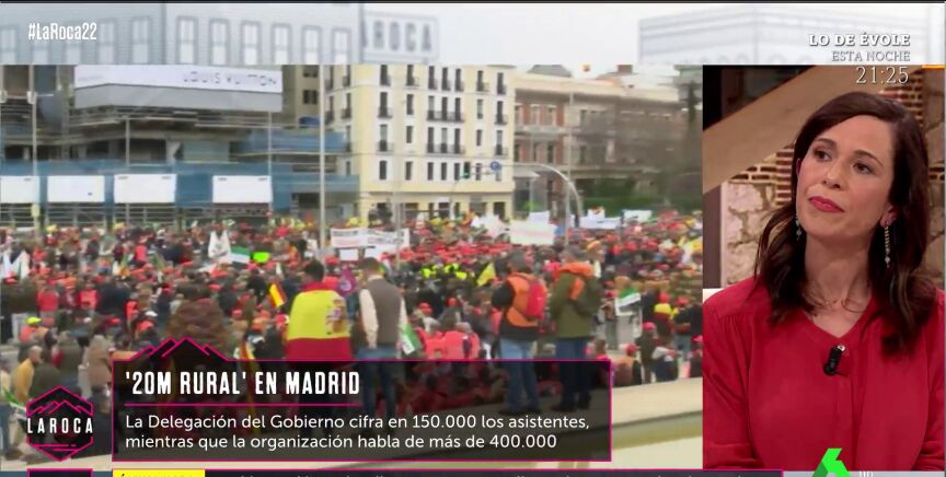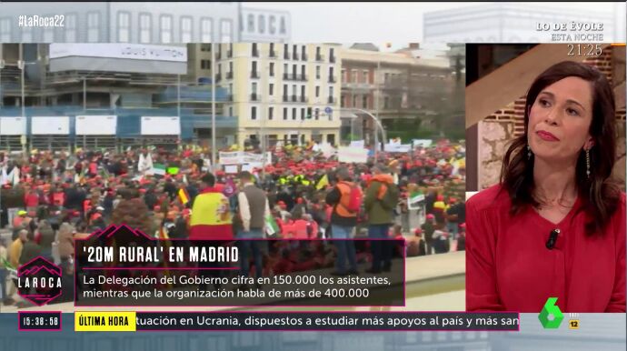 La periodista y colaboradora de 'La Roca' Ángeles Caballero ha considerado un "éxito apabullante" la manifestación que este 20 de marzo ha recorrido Madrid en defensa del campo y del mundo rural. "Me ha parecido una manifestación absolutamente abrumadora. Ha sido un éxito", ha definido Caballero.