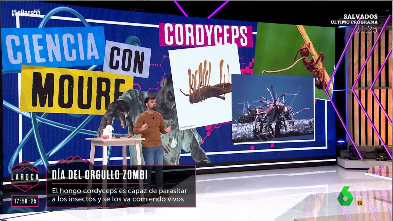 El científico Ricardo Moure afirmó en La Roca que "existen los zombis en la naturaleza". "El hongo cordyceps existe, y aunque no puede atacar a los humanos, puede convertir en zombis a los insectos", señaló, tras lo que mostró unas imágenes de "bichos poseídos por el cordyceps, a los que les salen como setas, que se expanden con el viento". " Una vez el cordyceps entra en ellos, sube hasta su cabeza y altera su comportamiento", indicó, aunque destacó que, por suerte, no puede infectar a humanos.