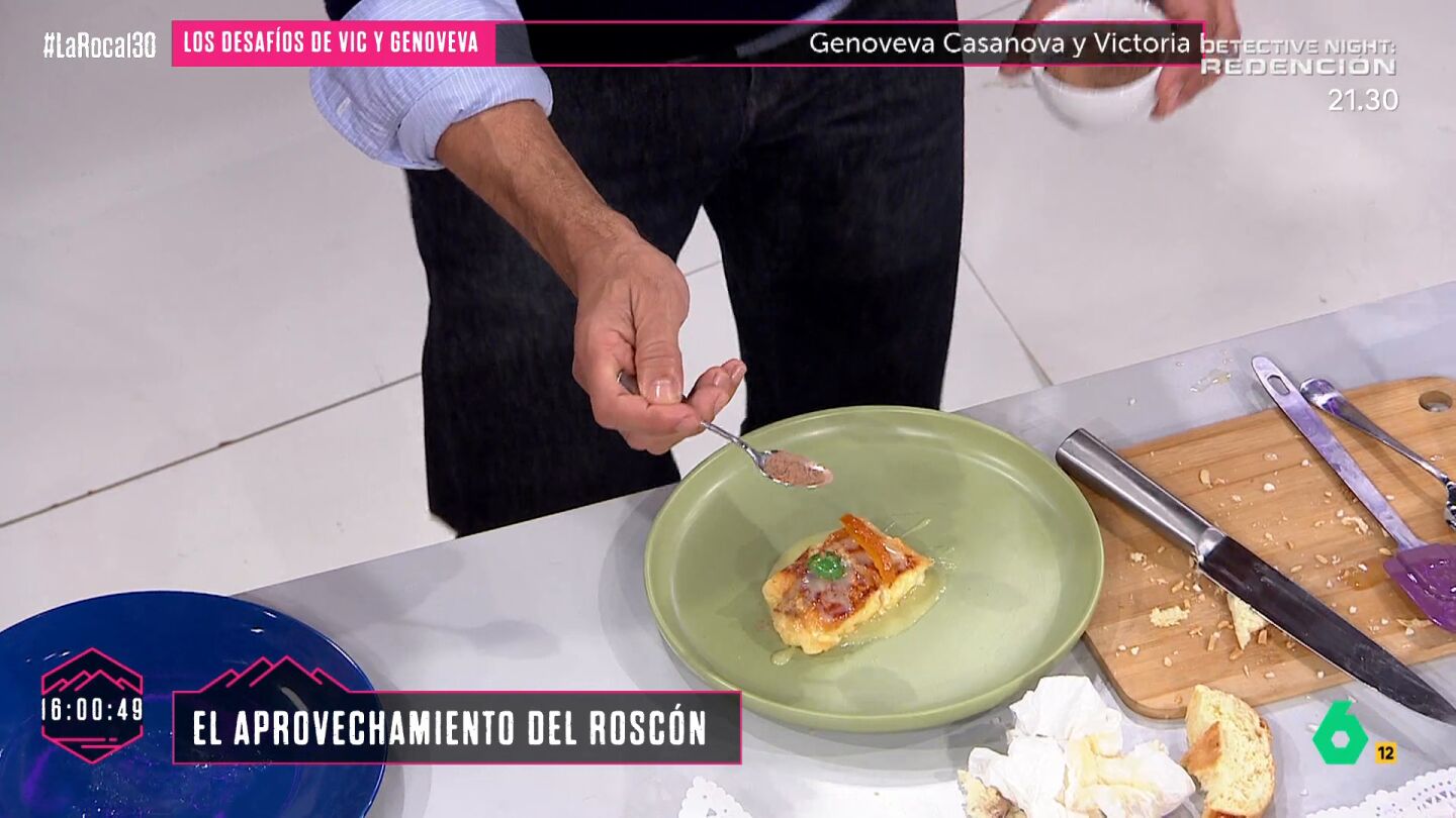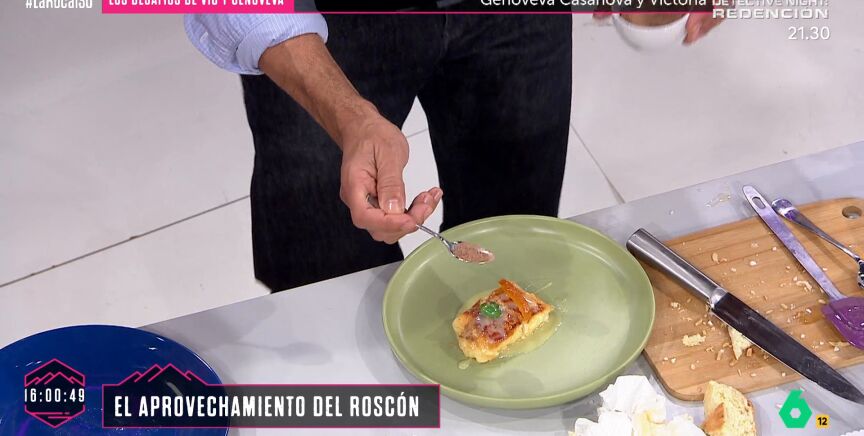 Juan del Val se somete a la guía de la colaboradora y corta los trozos de roscón en forma de cuadraditos, después los baña en leche y los pone en una sartén a freír. Luego hace una base de ganache y... ¡Ya estaría listo para comer! ¿Te atreves a probar esta nueva gastrotendencia que arrasa en redes sociales?