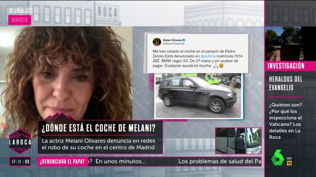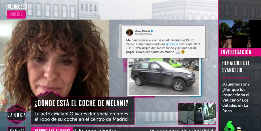 Melani Olivares denuncia en un vídeo, que se ha hecho viral, que le han sustraído el coche del parking de Pedro Zerolo. En La Roca hablan con ella para saber cómo ha sido y si se sabe algo del vehículo.