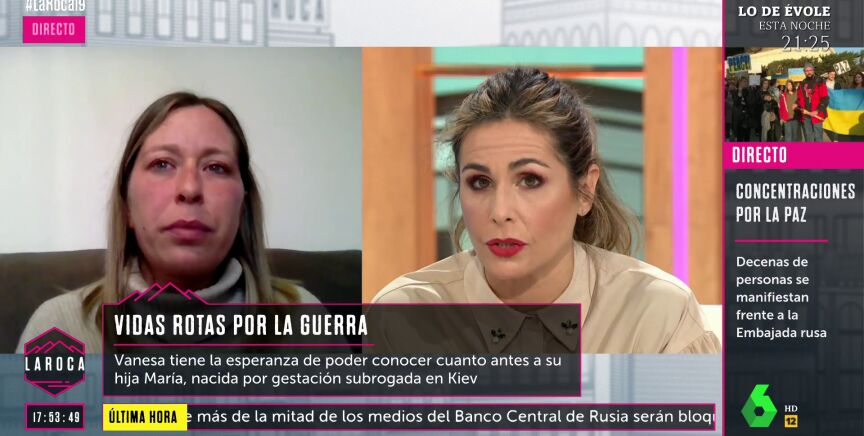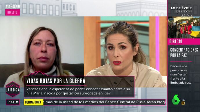 Nuria Roca ha entrevistado en La Roca a Vanesa, una madre desesperada por poder conocer cuanto antes a su hija María, nacida por gestación subrogada en Kiev. La gestación iba por la semana 38 cuando estalló la guerra en el país. Después de dos días sin tener noticias, este sábado tanto ella como su marido supieron que su hija había nacido: "Recibimos la información de que la niña estaba sana, que había llorado nada más nacer y que estaba en perfectas condiciones". No obstante, la situación es realmente difícil para ellos, ahora, dado que no tienen, por el momento, forma de traer a su hija a España.