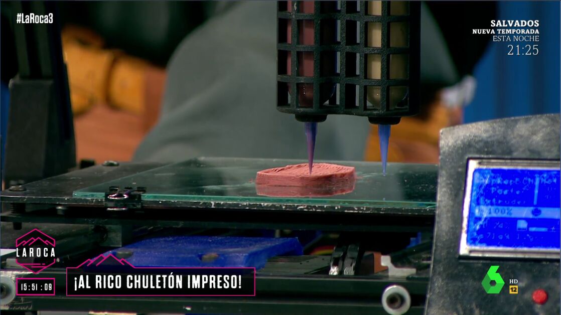 La Roca habla con dos miembros de la empresa 'Novameat' que han ideado una máquina que logra imprimir carne en tres dimensiones. Aseguran que el olor y el sabor es muy parecido al producto original.