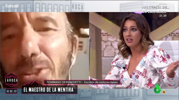 La Roca ha entrevistado a Tommaso Debenedetti, un periodista conocido por crear 'fake news' e inventarse la muerte de personalidades famosas como Elena Salgado, Vargas Llosa o el papa Francisco. Sus declaraciones han generado una enorme controversia en el plató del programa y la periodista Sara Ramos ha sido una de las personas que más indignación ha mostrado con lo que él hace.