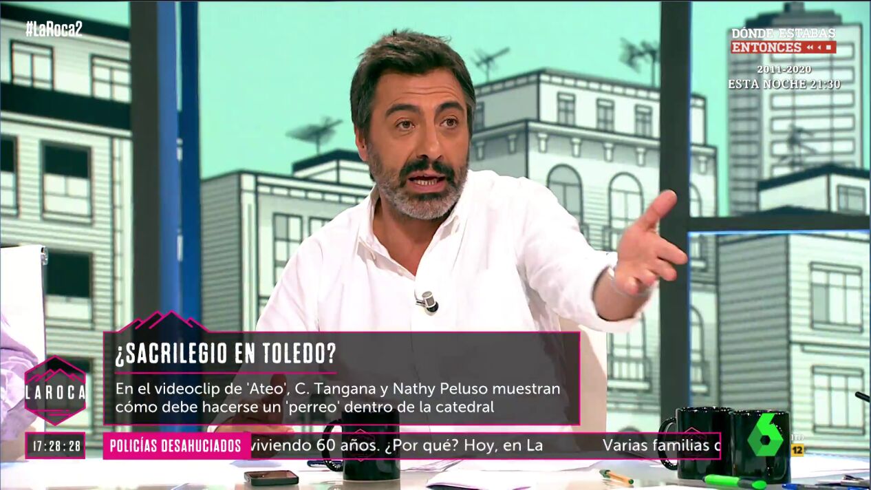 En La Roca se ha dado un intenso debate, con Juan del Val dejando clara su postura. "Esto es un rodaje; en las iglesias se han rodado películas, series... y no pasa absolutamente nada, es una sobreactuación constante", valora.