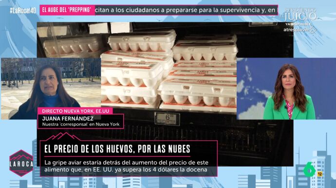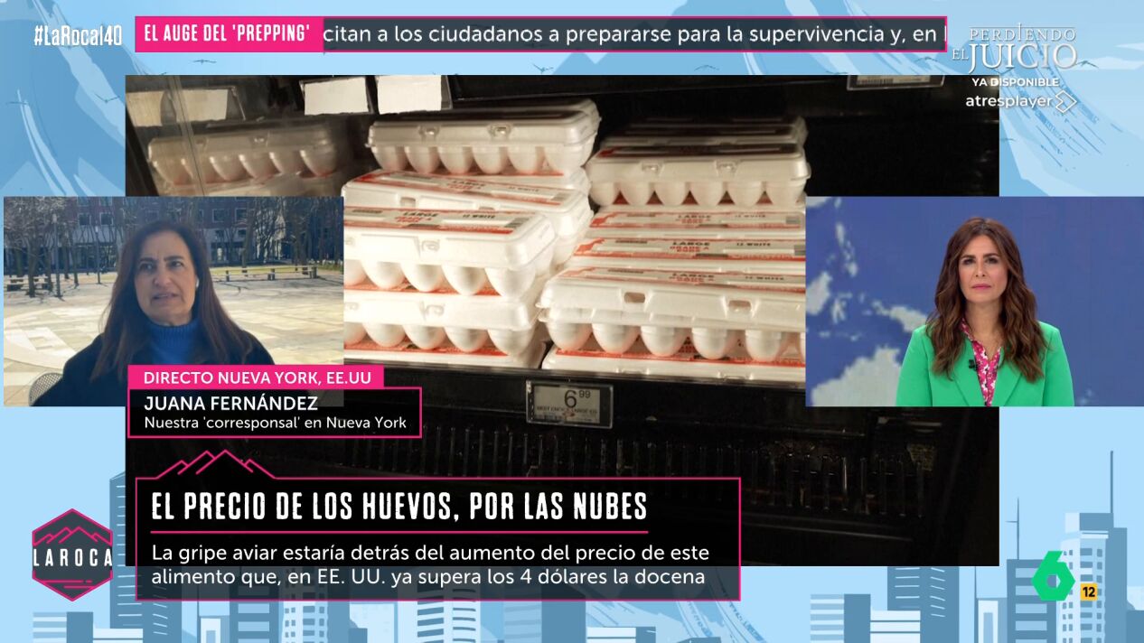 El precio de los huevos no para de subir en EEUU. Ante la 'crisis' que están sufriendo, Nuria Roca pregunta a Juana Fernández, corresponsal de laSexta en EEUU, "qué está pasando con los huevos" que, incluso, se han "empezado a alquilar gallinas".