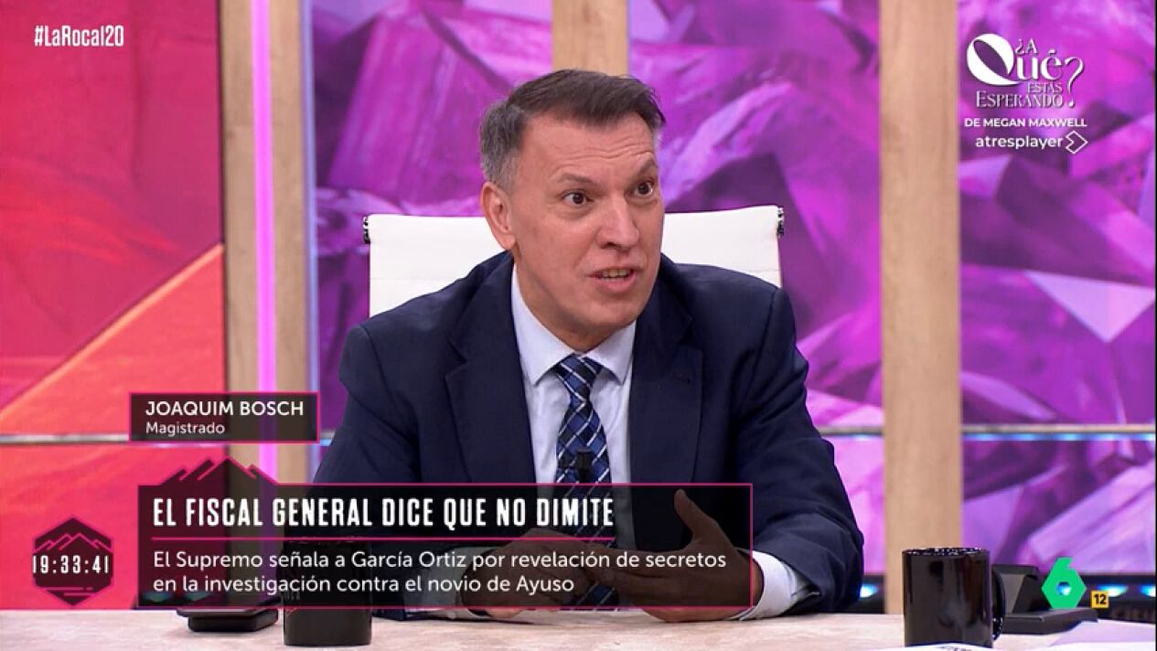 El magistrado y portavoz territorial de Juezas y Jueces para la Democracia, Joaquim Bosch, ha asegurado este domingo en La Roca que obviamente la filtración de los correos del novio de Isabel Díaz Ayuso, Alberto González Amador, es un delito, pero que "es muy difícil demostrar el autor de la filtración". Asimismo, ha asegurado que al fiscal general del Estado, Álvaro García Ortiz, imputado por este caso, "no hay ninguna ley" que le obligue a dimitir.
