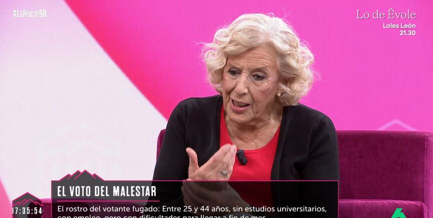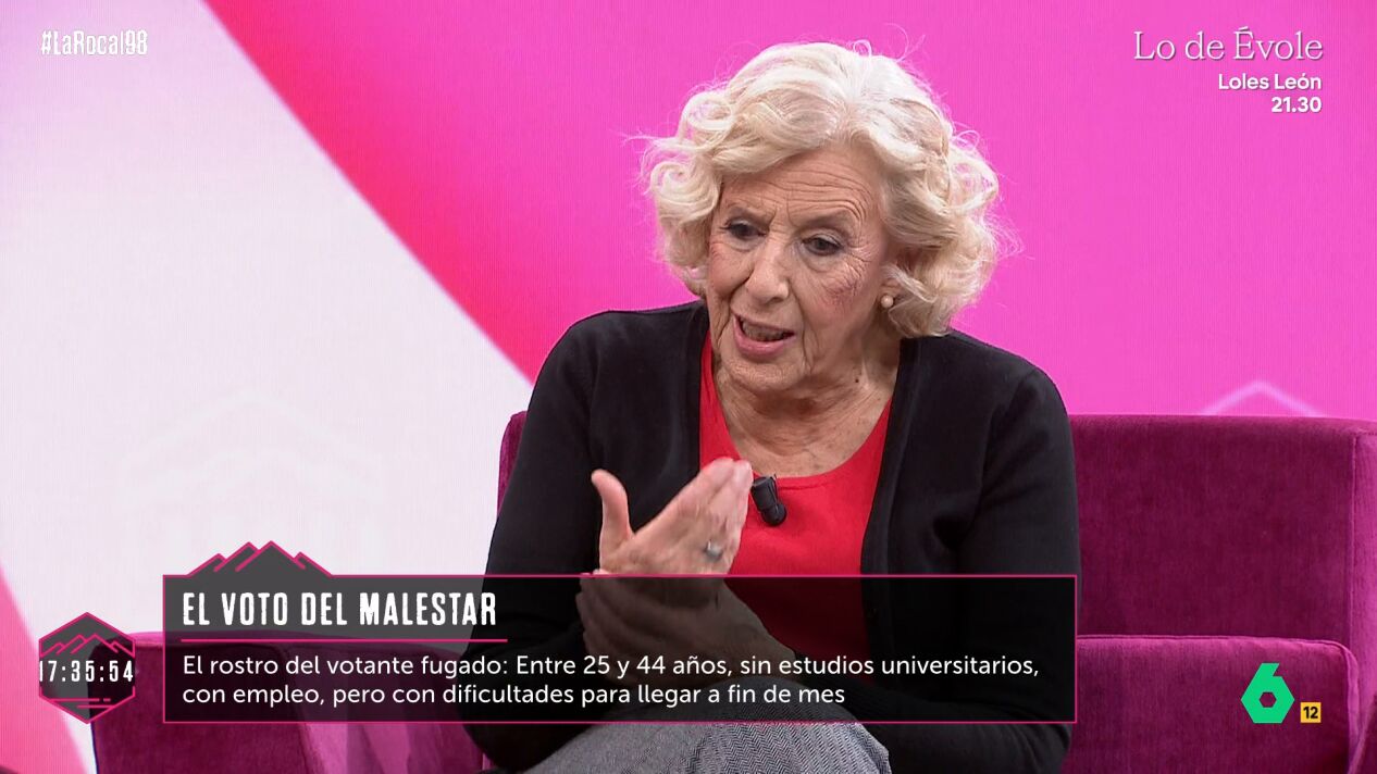 "Respecto a la izquierda, ¿dónde reside el problema? ¿En la falta de proyecto? ¿En la lucha de egos? ¿En que solo se piensa en el resultado electoral y no en los avances?", pregunta Nuria Roca a Manuela Carmena, que visita el plató de La Roca para charlar sobre la situación política en España.