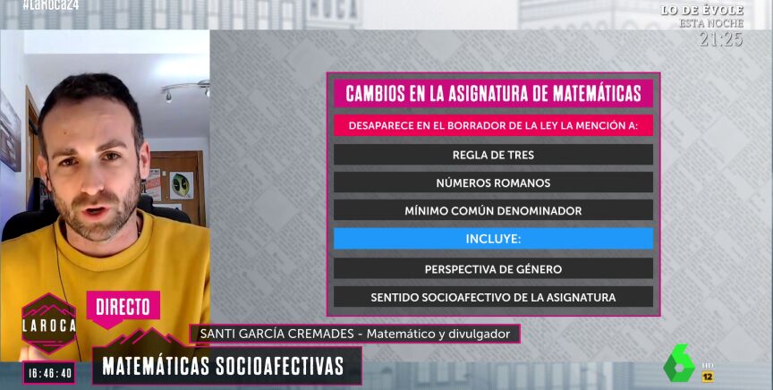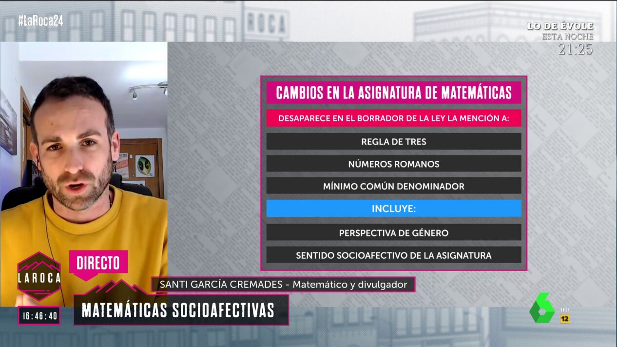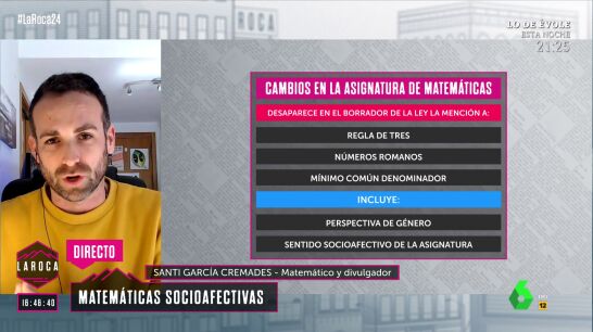 ¿Qué se pretende conseguir con la reforma educativa que añade la etiqueta de socioafectivas a las matemáticas? Para resolver las dudas que rodean a los cambios en esta asignatura, en La Roca hablamos con el matemático y divulgador Santiago García Cremades.