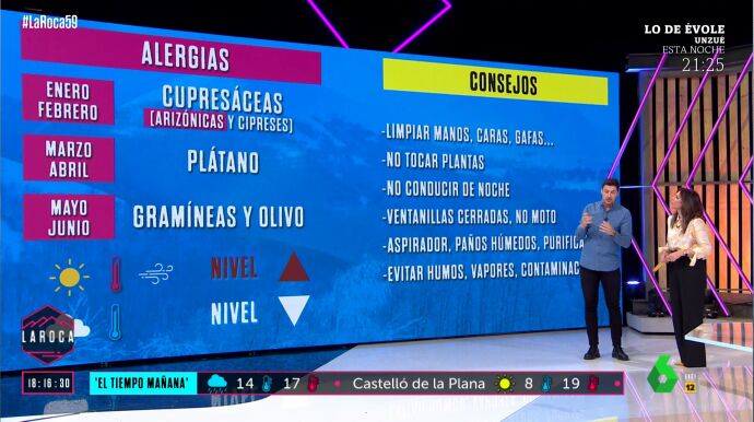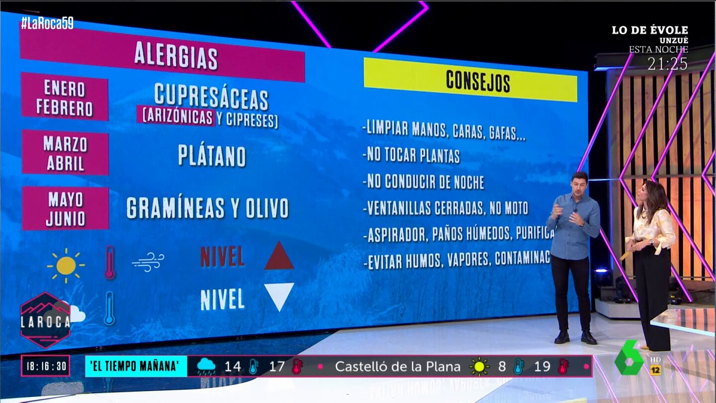 El meteorólogo de laSexta también quiso dar algunos consejos a los alérgicos al polen, como que se limpien mucho manos, cara y gafas; no conducir de noche si se toman antihistamínicos porque dan mucho sueño; tener las ventanillas del coche cerradas; y en casa usar aspirador en lugar de escoba, paños húmedos y, si se puede, purificadores de aire.