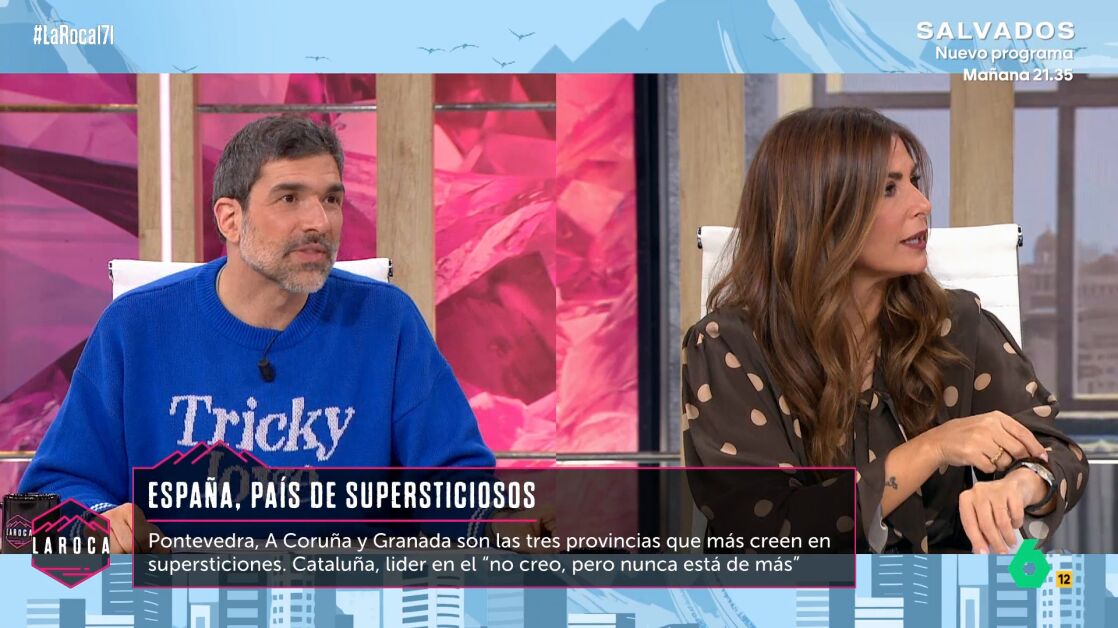 "Menos mal que no soy supersticiosa", comenta Nuria Roca con una sonrisa en la cara, para después reconocer que, en el fondo, sí que lo es un poco. "Ya hemos hablado aquí que Nuria tiene que empezar el programa mirándose la hora y, un minuto antes de empezar La Roca, ya está mirando el reloj", señala Nacho García como ejemplo de lo supersticiosa que es la presentadora.