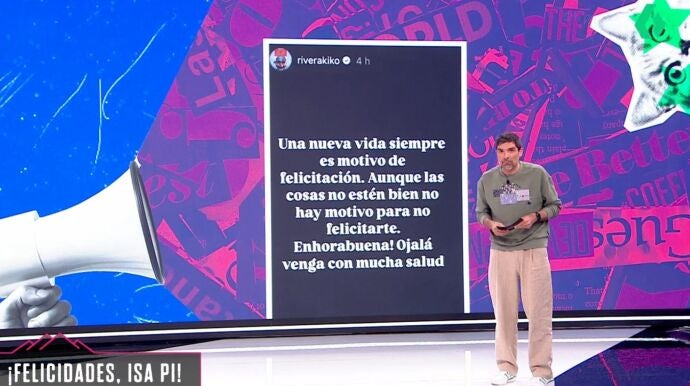 "Está embarazada, enhorabuena. De poco, de tres días. Estoy yo casi más embarazado que ella. Le damos la enhorabuena, pero de verdad. No como hizo Kiko Rivera", contó.