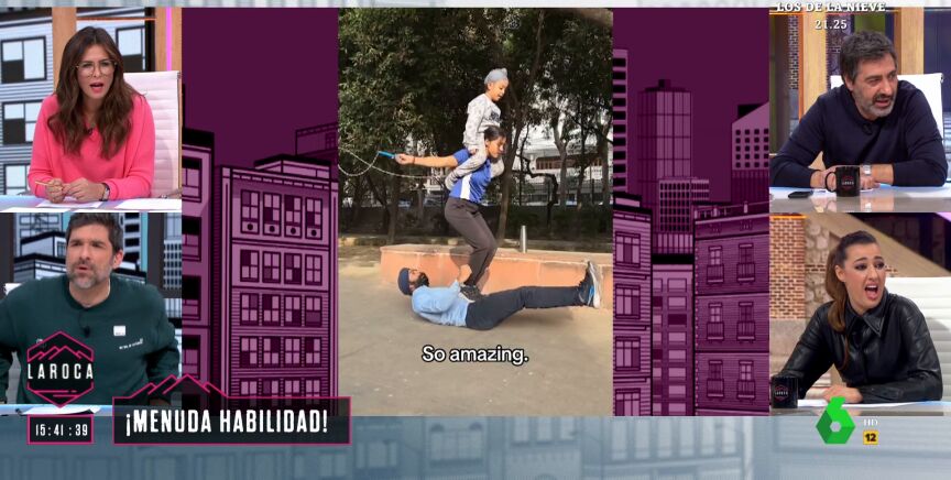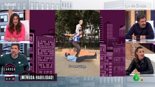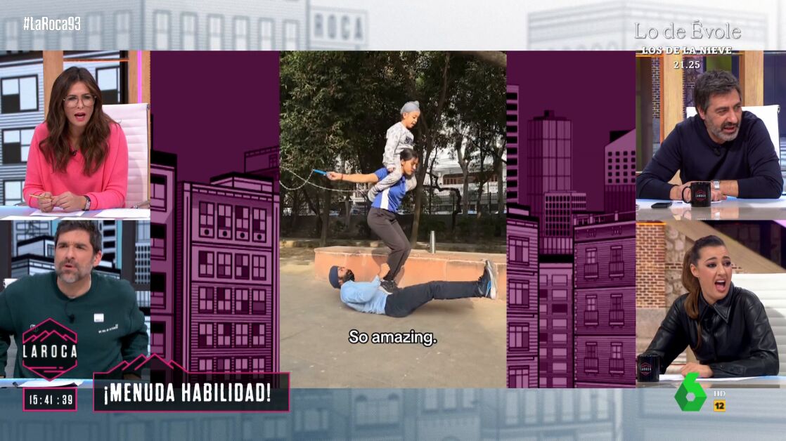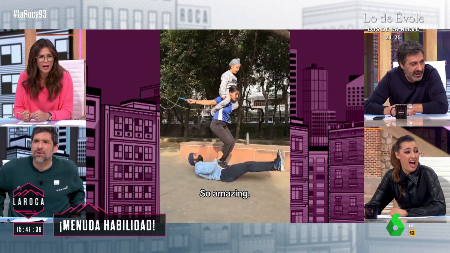Nacho García ha mostrado en La Roca un sorprendente vídeo en el que se puede ver la habilidad de tres personas para saltar a la comba de una manera de lo más original. En el vídeo se puede ver cómo un hombre se tumba mientras que una mujer, que sostiene a una niña en sus hombros, se pone de pie encima de su cintura.