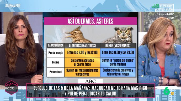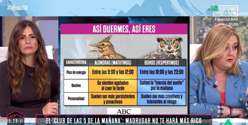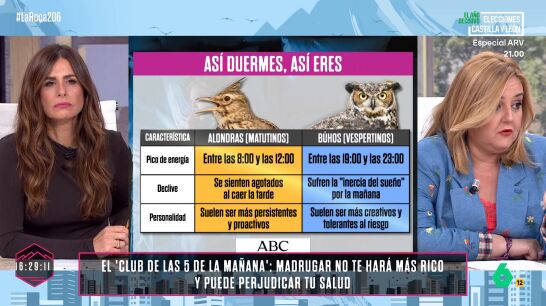Pilar Vidal ha hablado en La Roca de los "dos tipos de personas" que hay dependiendo de las horas de sueño. Dependiendo de cómo se duerma y de cuándo y cuánto. En el programa, ha diferenciado a los "alondra" y a los "búho", teniendo además cada uno su propio tipo de personalidad.
