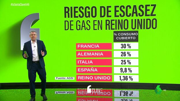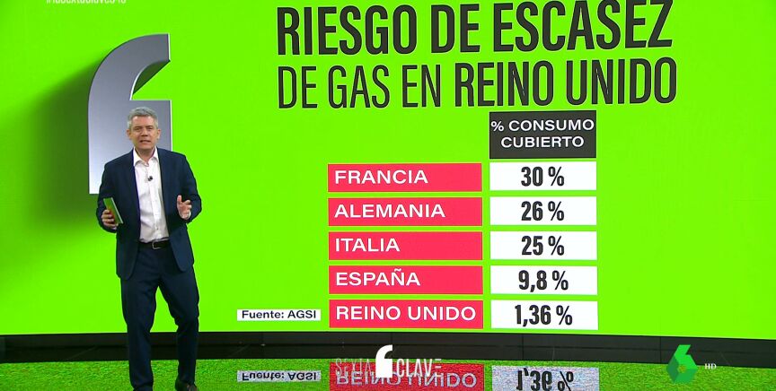 Alerta del regulador de energía en Reino Unido para este invierno: existe un riesgo "significativo" de escasez de gas. Los datos de sus reservas son desalentadores. Para comprobarlo basta con comparar las cifras del país británico con las de otros países: Francia tiene almacenado como para cubrir el 30% de su consumo; en Alemania, un 25%; en Italia, otro 25%; España, casi un 10%. ¿Y Reino Unido? Un 1,36%. Su capacidad de almacenaje es mínima porque solo tienen activas tres plantas para acumular gas.