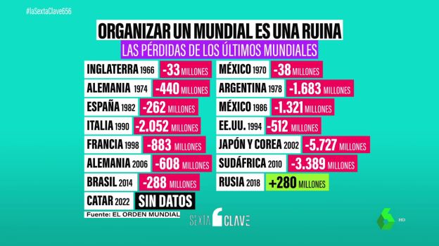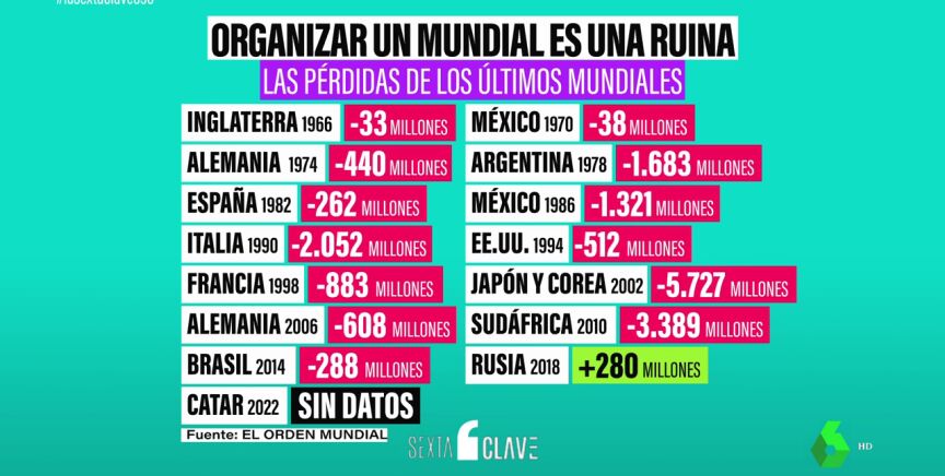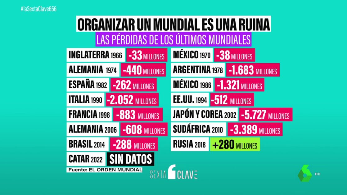 Entonces, ¿por qué se siguen organizando mundiales? Los 14 últimos mundiales (1970-2022) acumulan unas pérdidas de 17.000 millones. Pérdidas que asumen los gobiernos que solicitan la organización del Mundial. Y como cada cuatro años es un país distinto, pues el negocio va subsistiendo. Sin embargo, en los últimos años, a diferencia de antes que lo organizaba un sólo país, ahora son cada vez más son varios países. En 2026 serán Estados Unidos, México y Canadá. Y en 2030, como ya sabemos, cinco países más acompañarán a España. Así que los costes se repartirán.