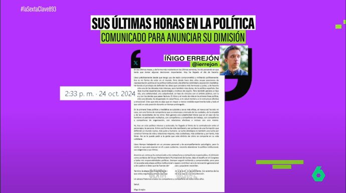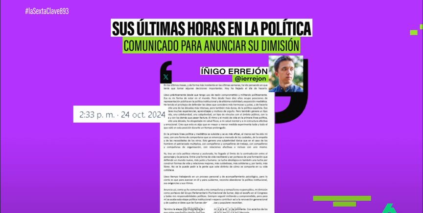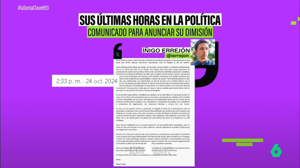 Íñigo Errejón ha dimitido de todos sus cargos a través de un comunicado publicado en sus redes sociales. Sin embargo, cuando se le vio por última vez este miércoles en el Congreso, hablando como portavoz de Sumar, su partido ya había comenzado a investigarlo.