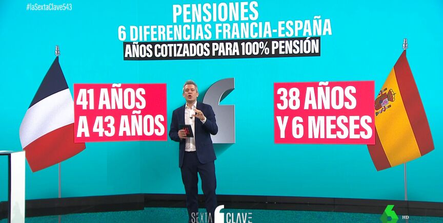 - Tercera diferencia: el cómputo. Los años para calcular cuánto vas a cobrar. En Francia, la reforma no los cambia. Los 25 mejores años de la vida laboral. En España sí se modifica: o los últimos 25 o los últimos 29 eliminando los peores 24 meses.