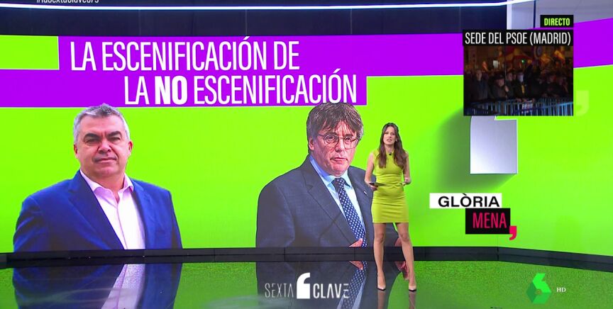 En medio del acuerdo, una fotografía. Pero no es una foto conjunta de PSOE y Junts, sino dos imágenes por separado: una del secretario de Organización del PSOE, Santos Cerdán, y otra del expresident catalán Carles Puigdemont. La escenificación de la no escenificación, un gesto que habla por sí mismo.