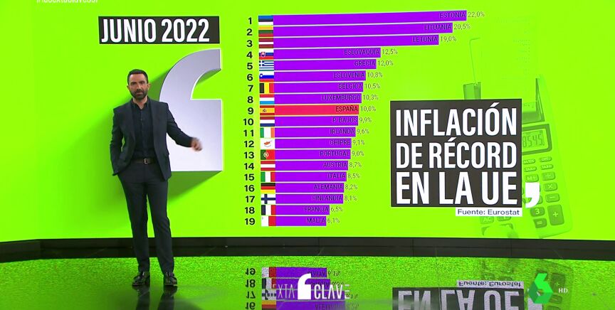 En este mes es especialmente llamativa la subida de Países Bajos, donde la inflación se disparó al 11,7%. Abril supuso un ligero descenso, pero solo para España y "unos pocos privilegiados más", porque Alemania, Francia o Portugal seguían en plena escalada. Y así llegamos a mayo donde, con una nueva subida, España se colocó duodécima. Eso sí, en junio, como se ha dicho anteriormente, dimos un buen salto en la tabla, ya que el dato estimado nos ha colocado con un tasa del 10%