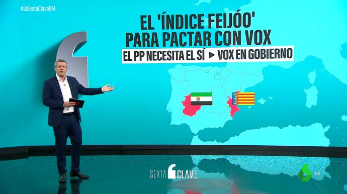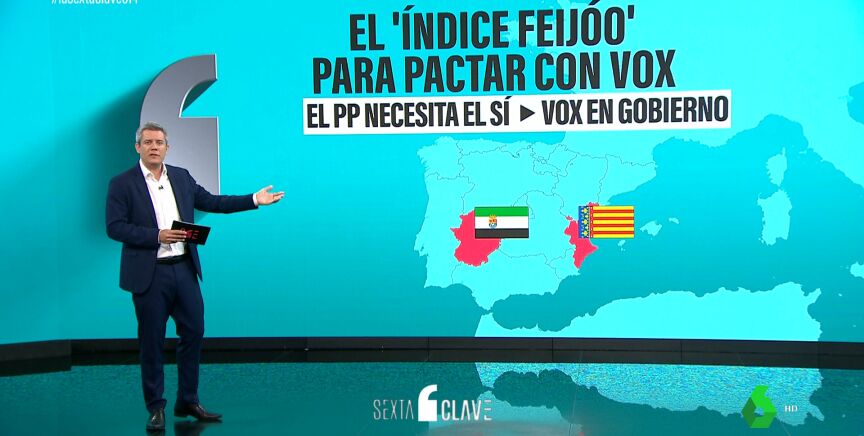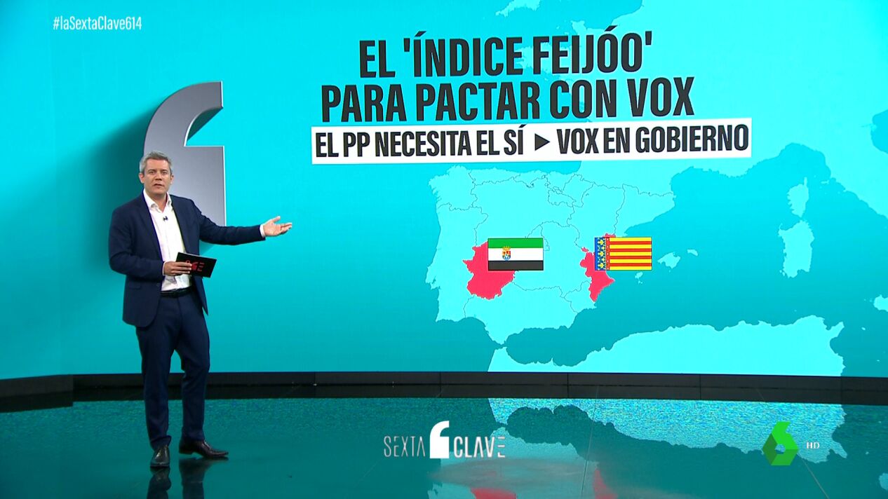Con ese 'Índice Feijóo', se puede explicar lo que está ocurriendo en las comunidades autónomas. En la Comunitat Valenciana y Extremadura el PP necesitaba el 'sí' de Vox para poder gobernar, con Carlos Mazón y María Guardiola metiendo en sus gobiernos a consejeros de Vox. En Valencia, una vicepresidencia y las consellerías de Justicia y Agricultura. En Mérida, la consejería de Gestión Forestal a unos negacionistas del cambio climático.