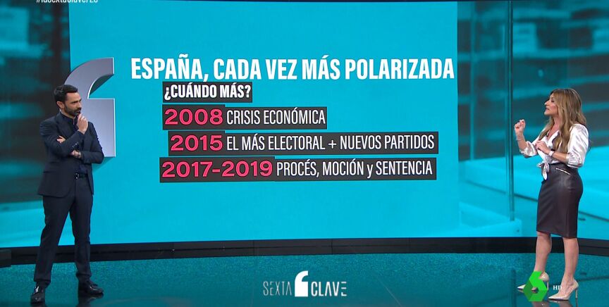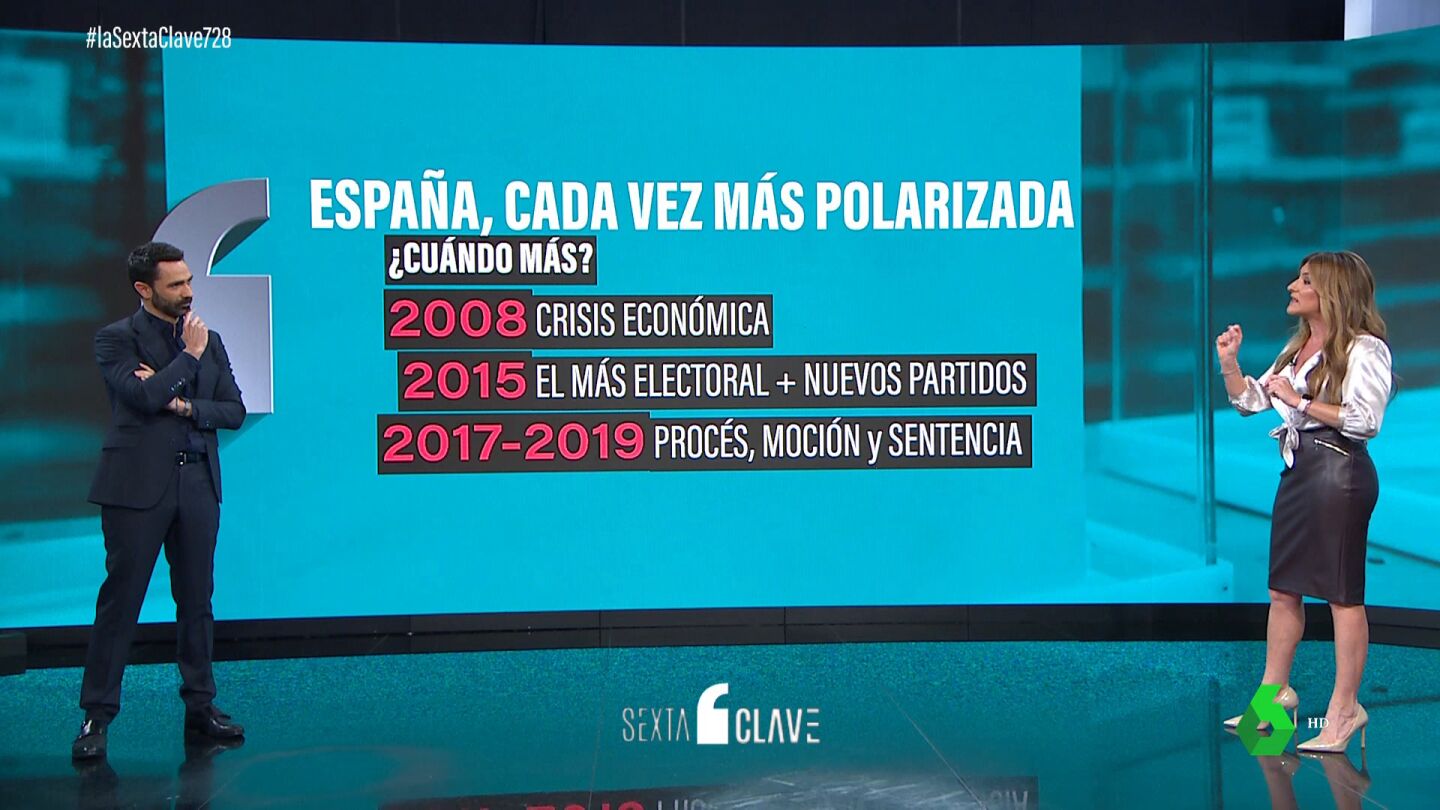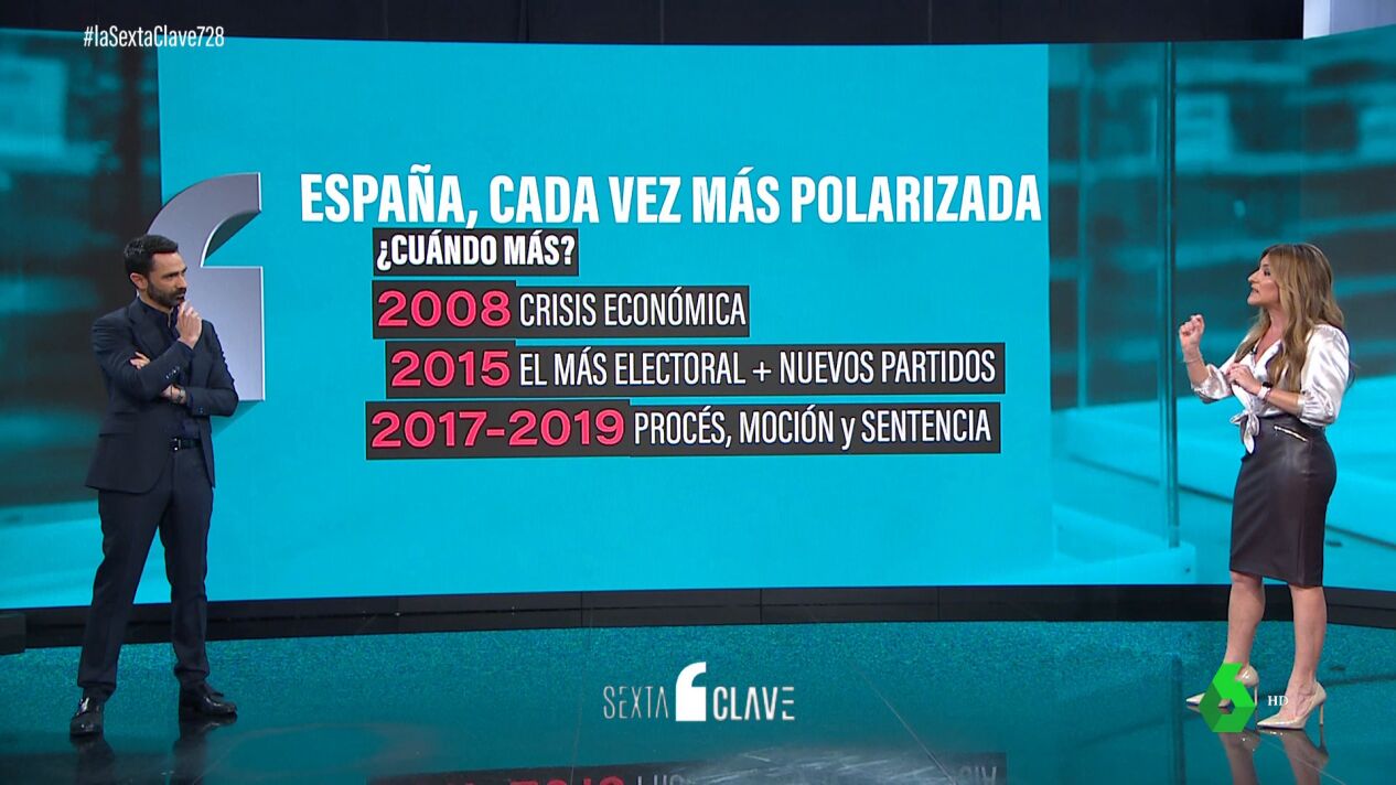 En el año 2008, la crisis económica aumenta las diferencias económicas y laborales en España; en 2015, vivimos el año con más elecciones de la historia, con cinco, así como la irrupción de Podemos y Ciudadanos en la política. Por último, entre 2017 y 2019 se viven los años clave del 'procés', siendo la cuestión territorial un factor polarizador que, además, coincide con la llegada de Pedro Sánchez a la Moncloa a través de la moción de censura contra Mariano Rajoy.