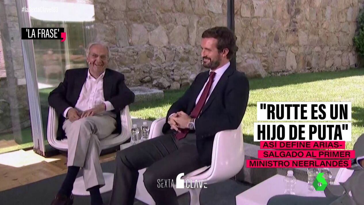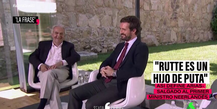 Arias-Salgado ha insultado al primer ministro de Países Bajos, Mark Rutte, al que ha llamado "hijo de puta". "He leído que Rutte, el holandés, que es un hijo de puta, pero que va a vigilar estrechamente la concesión y la aplicación de los fondos europeos de España", ha dicho el expolítico, quien ha soltado una carcajada nada más decir el insulto.