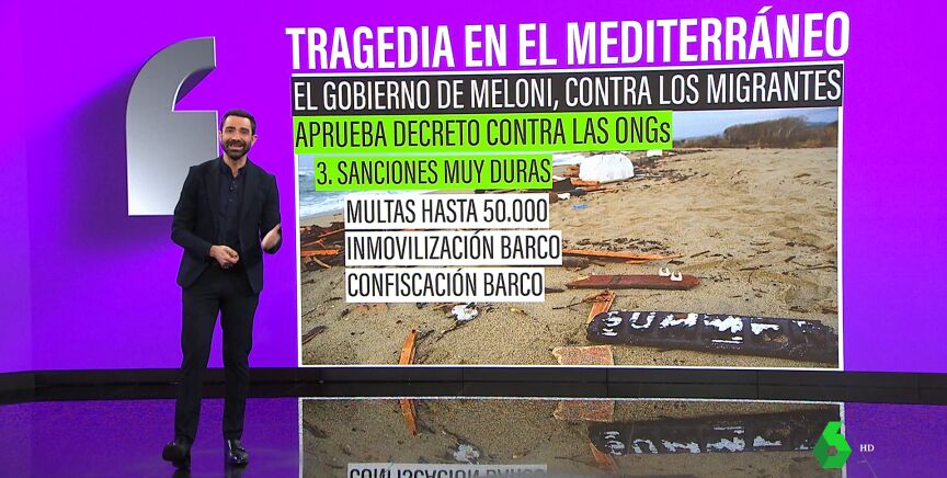 Segunda traba: los barcos deben ahora pedir asilo nada más realizar el rescate, sino, no les dejan desembarcar. ¿Conclusión? La misma. No pueden seguir rescatando. Tienen que ir a puerto aunque tengan capacidad para más personas. Y tercer obstáculo: sanciones desorbitadas a quienes incumplan estas normas. Multas de hasta 50.000 euros, inmovilización de barcos e incluso llegar a confiscarlos. El Gobierno italiano, de extrema derecha, quiere que se rescate al menor número de migrantes posible. Eso significa más naufragios, más muertes, más sufrimiento y menos humanidad.