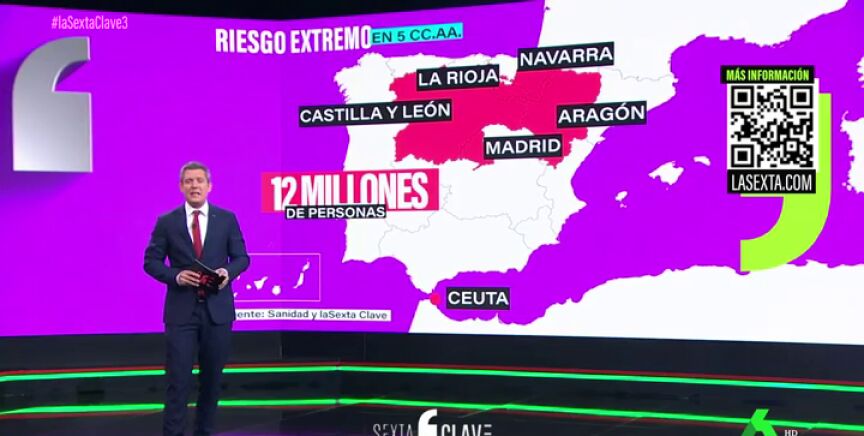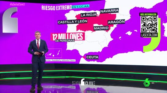 Este documento, al que ha tenido acceso laSexta, contempla cuatro niveles de alerta. Es lo que en laSexta Clave llamamos el "semáforo" de Sanidad. Así, Navarra, Aragón, Castilla y León, Madrid y La Rioja, además de Ceuta, están en alerta nivel 4.