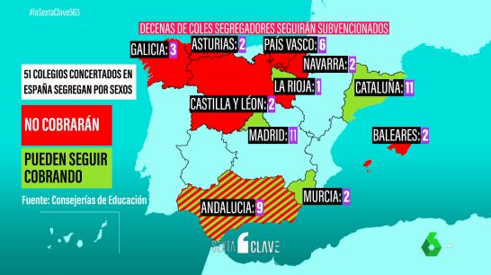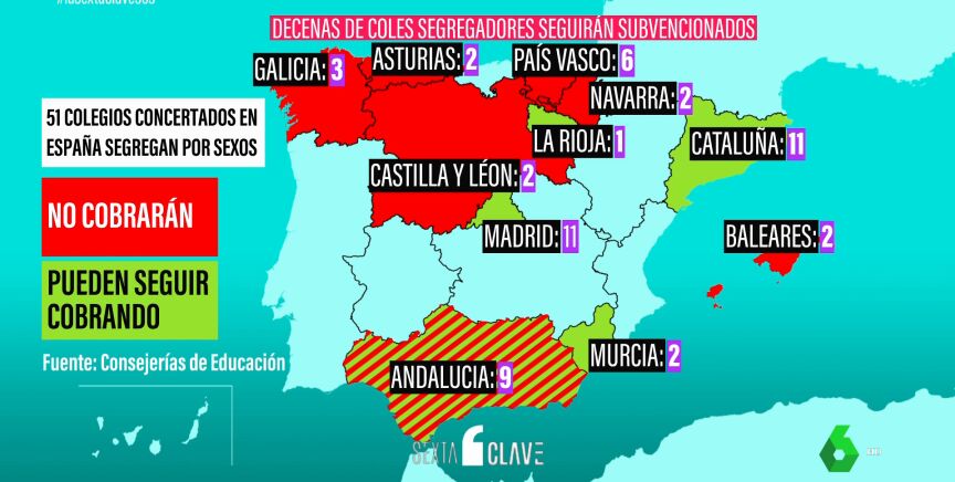 No ha sido casualidad. Ha sido un plan tramado por algunos gobiernos autonómicos. A día de hoy hay 51 colegios concertados en España que separan a alumnos y alumnas. Presentes en 11 comunidades autónomas. Con Cataluña, Madrid y Andalucía a la cabeza. Al menos 25 de ellos seguirán cobrando. Andalucía no ha dado información sobre los conciertos. Las comunidades de Cataluña, Madrid, La Rioja y Murcia sí.