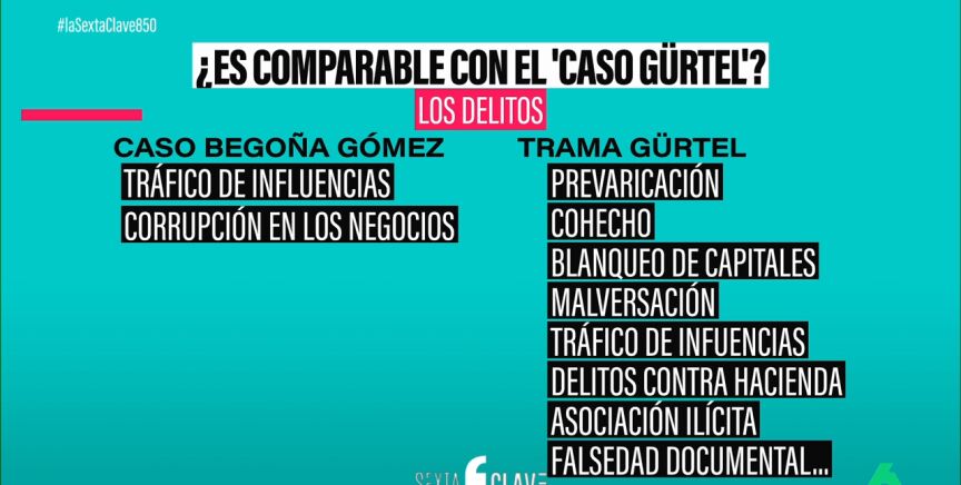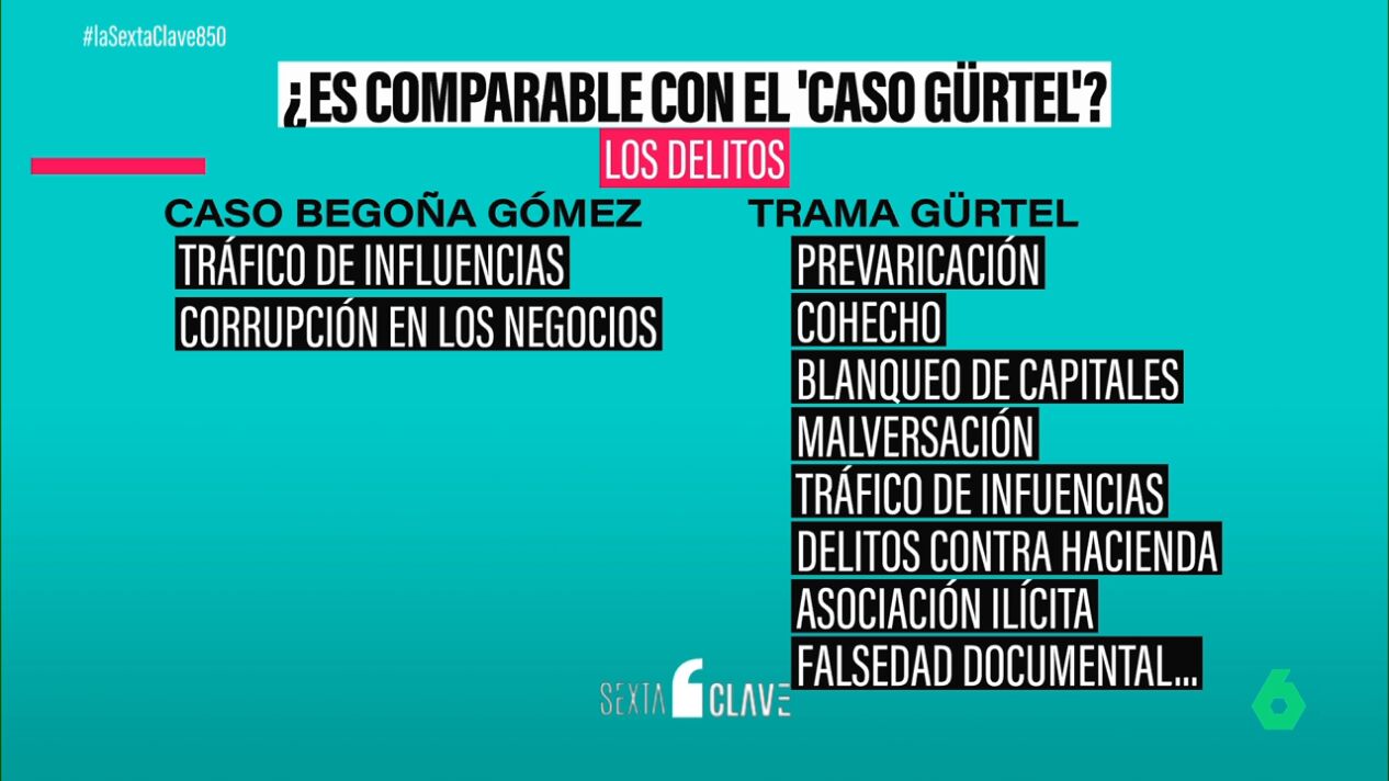 Otra diferencia son los delitos. A Begoña Gómez se le investiga por tráfico de influencias y corrupción privada, mientras que los delitos que el juez consideró probados en la trama Gürtel son el de prevaricación, cohecho, blanqueo de capitales, malversación, tráfico de influencias, delitos contra Hacienda, etc.