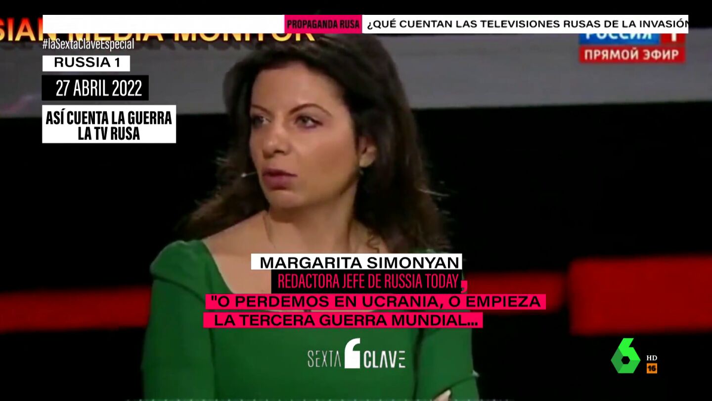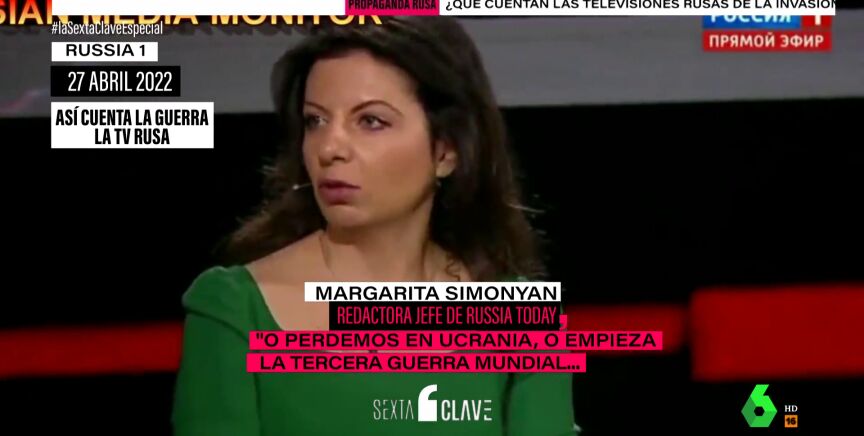 Así lo ha defendido la redactora jefa de 'Russia Today', Margarita Simonyán, alguien con línea directa con el Kremlin. "O perdemos en Ucrania o empieza la tercera guerra mundial. Personalmente, creo que el escenario más realista es el de la tercera guerra mundial, conociéndonos a nosotros y a Putin", ha llegado a mantener en la televisión pública. Insistiendo: "Me parece que es más probable que todo termine en un ataque nuclear que rendirnos".