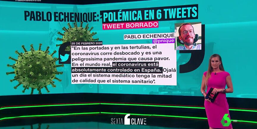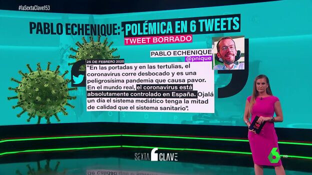 En este vídeo, Alba Blanco repasa en laSexta Clave cuáles han sido los seis tuits más controvertidos de Pablo Echenique, que ha borrado todos sus mensajes anteriores al 4 de junio en dicha red social.