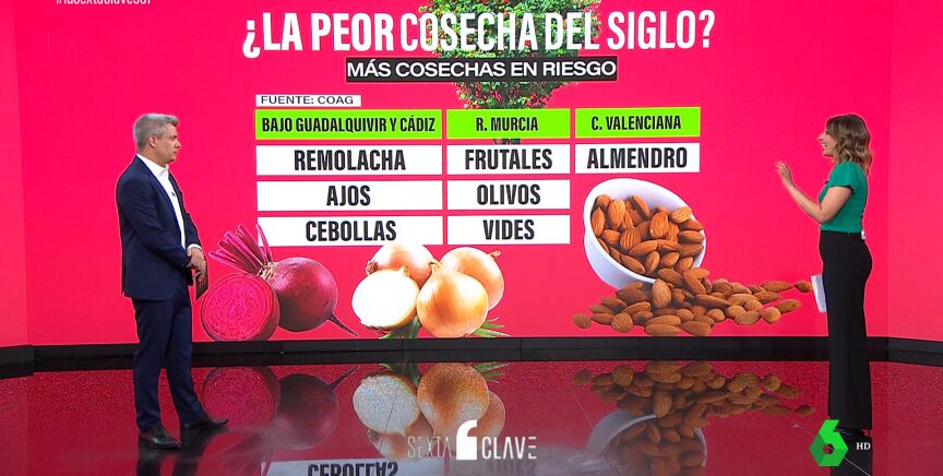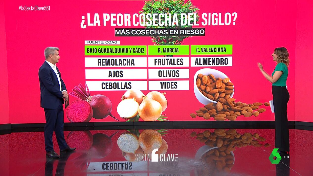 Pero hay más, porque las cosechas de remolacha, ajos y cebollas corren peligro en Andalucía, concretamente en el Bajo Guadalquivir y Cádiz. Viajando hasta Alicante, en la Comunidad Valenciana, hay cultivos como el almendro que tendrán que ser replantados si no llueve en abril y mayo. Replantar llevaría unos cinco años para recoger los frutos, algo que también pasa en Murcia con frutales, olivos y vides.